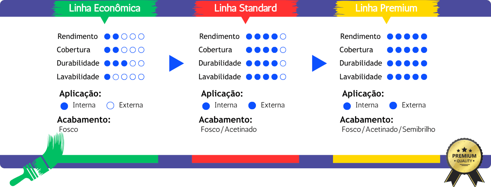 Linha superior, com excelente cobertura, resistência e durabilidade. Recomendadas para ambientes internos e externos, oferecem ampla variedade de cores e acabamento sofisticado (fosco, acetinado ou semibrilho).
